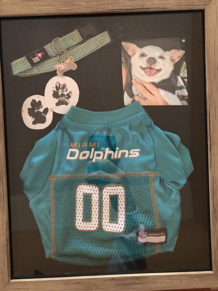 Sports can also strongly influence our emotions. One of the biggest reasons I even decided to start this blog was because of an experience that recently had a powerful effect on my life and the way I view sports. A few years ago my girlfriend and I decided to adopt a dog named Elmer. He was a senior chihuahua who had been abused, so we just wanted to give him all the love that we could so that his remaining years would be filled with happiness. In return, he brought more happiness into our lives than we ever thought imaginable. Every football Sunday, Elmer and I would put on our matching jerseys, sit side by side in front of the TV, and root for the Dolphins to win. Unfortunately, he passed away about a month and a half ago. It was a rough time for me, especially since he was the only other dolfan I really had around to watch the games with. The Sunday after he had passed was the Dolphins/Patriots showdown in Miami. I decided to lay little Elmer’s jersey out next to me for good luck. Fast forward to the end of the game. I’m sitting there, somewhat dejected, wishing the dolphins could have found a way to lift my spirits. “Theres no way they win this game”, I said to my girlfriend who was sitting next to me clueless as to what was going on. You all know what happened next. The Miami Miracle. As I watched Kenyan Drake race past Gronk into the end zone for the win, I was overcome with raw emotion. Tears ran down the side of my face as I lifted Elmer’s jersey into the air, screaming my lungs out in pure joy. It is a moment I will never forget for the rest of my life.